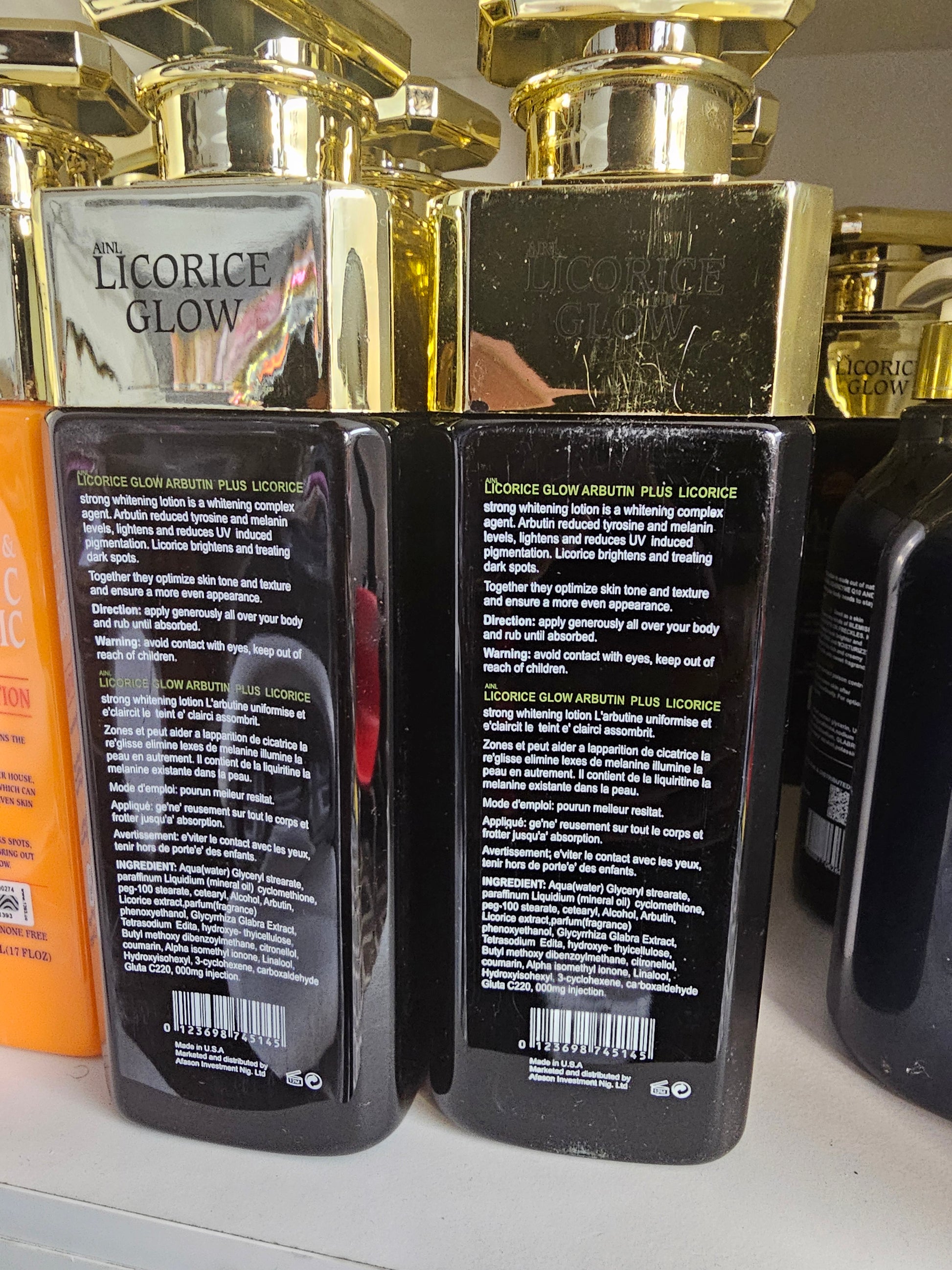 Experience luminous and radiant skin with Licorice Glow 24k Gold Lotion. Infused with licorice and 24k gold, this super whitening body milk deeply nourishes and hydrates for a brighter, more even complexion. Revel in the luxurious, glowing results of this powerful formula.