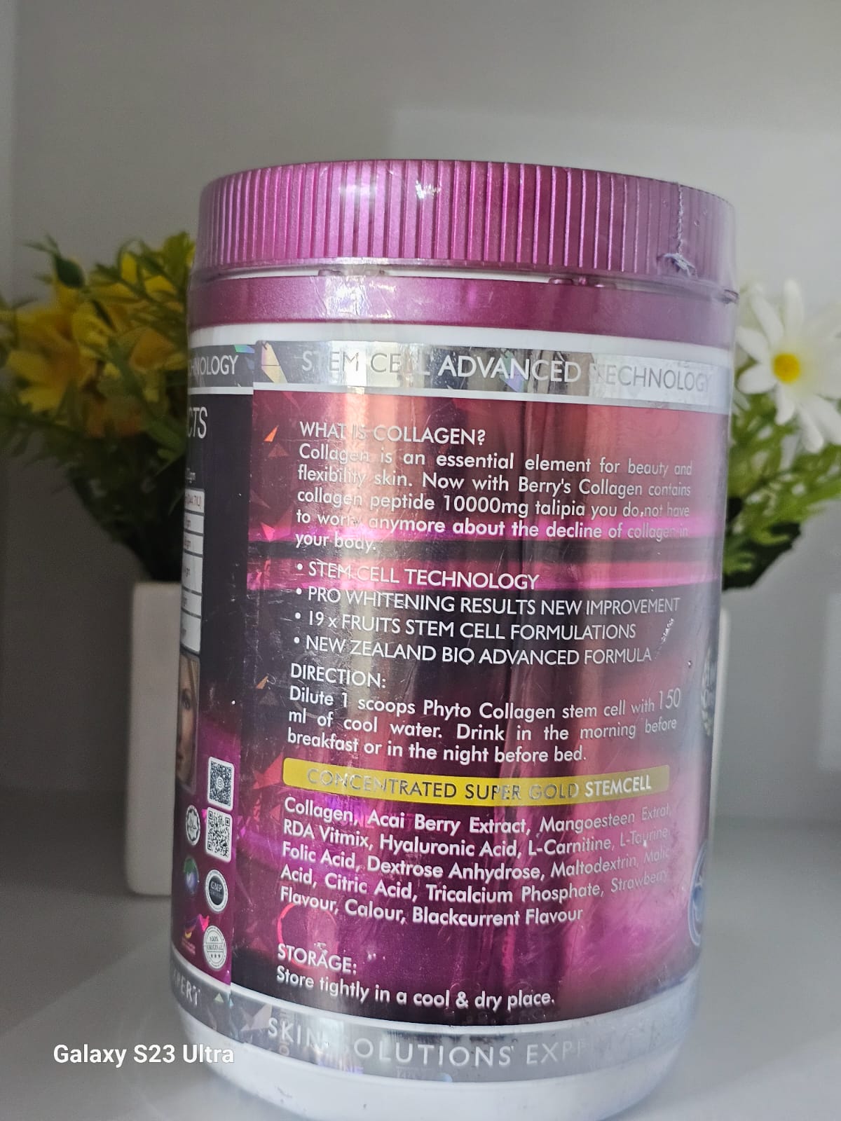 contains folic acid, citric acid, hyaluronic acid, acai berry extract, etc.